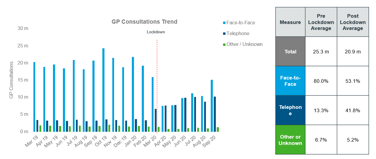 九月份才看到转回预期数GP咨询比预锁有趣的是,注意到这些任命从面对面转向电话分配(图1)。电话预约百分数在过去数月中增长3倍,平均13.3%前COVID封锁达41.8%。过渡预期需要数年时间,现已在不到9个月后实现。会不会是前方新常态方法 并可能影响社区药店当前所见 的面对面接触
