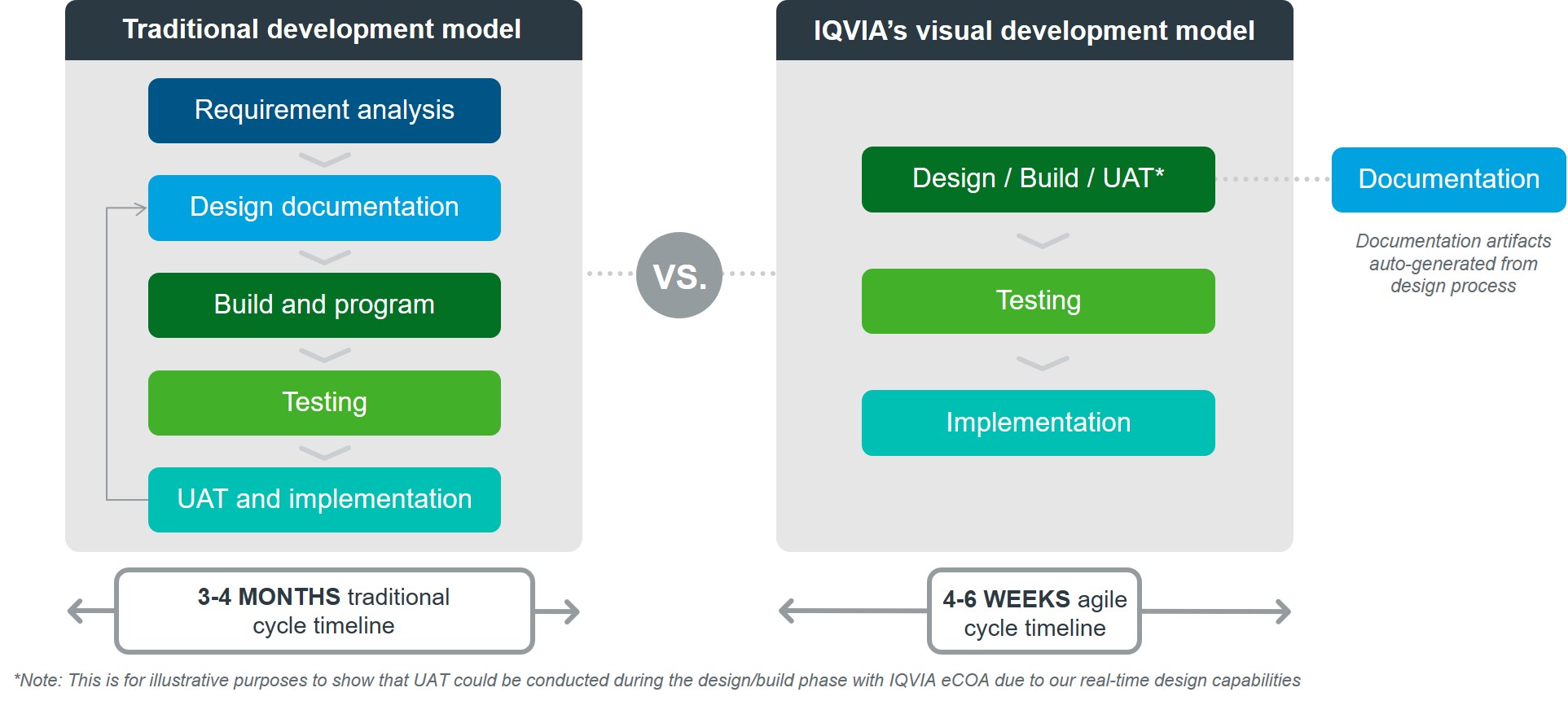 通过使用敏捷开发方法、平台内置翻译、预构建评估和自动生成文档,IQVIA eCOA可以为赞助商在整个学习期间提供极大的效率和灵活性。由于能够进行实时更改,赞助商可以定制他们的研究,并根据监管反馈进行调整,而无需担心增加额外的时间。