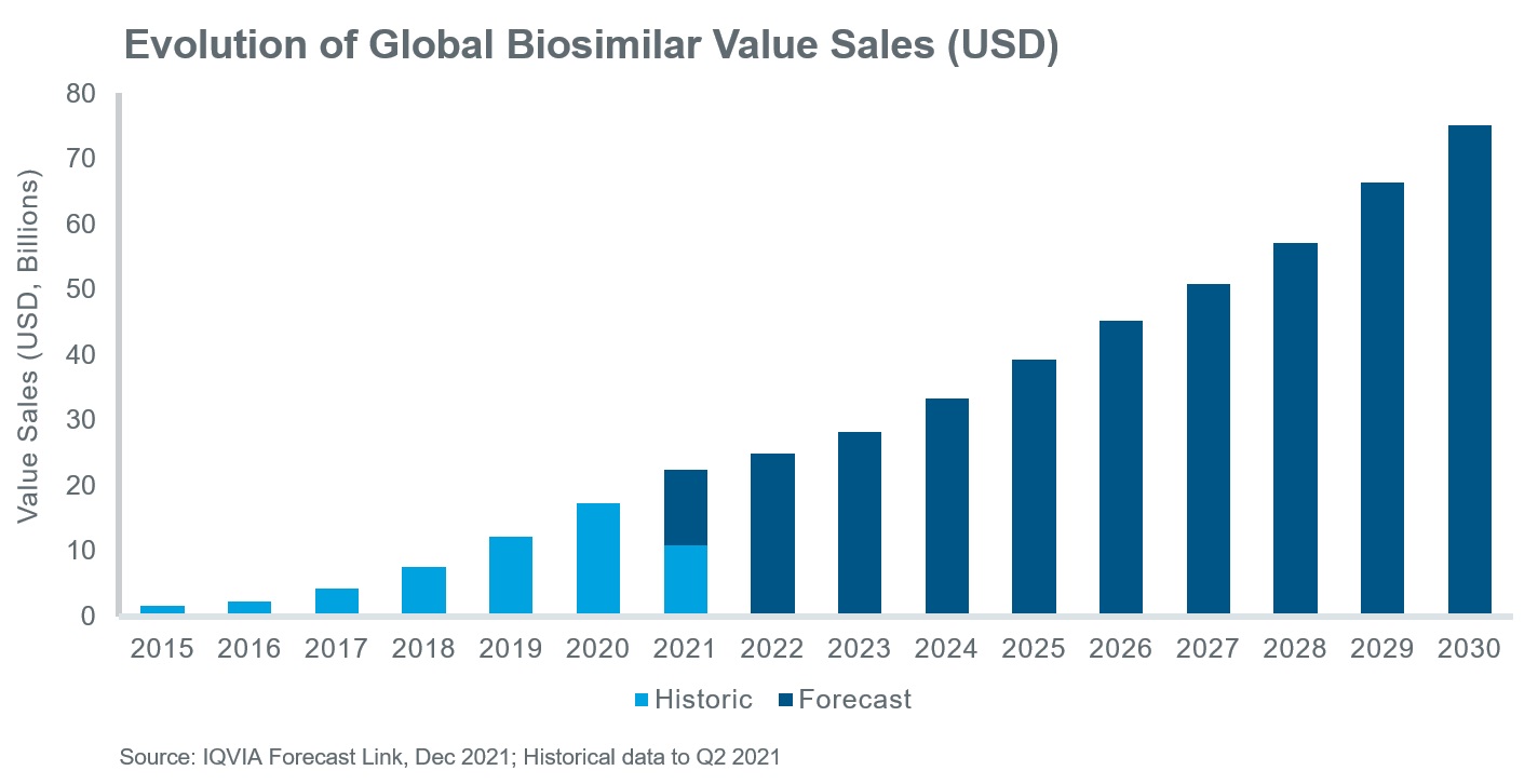在全球范围,上层生物相似物吸收量快速增长,这一趋势看似将在未来十年继续发展下去。IQVIA预测链路显示,2015-2020年期间生物相似值增长78%,2020年约达17.9bn,预计2020至2030年期间CAGR继续增长15%,未来十年内估计达75bn文章侧重于最近和预期未来生物相似物的摄取率以及不同地理和分子预期的不同摄取率此外,还简要探讨预期增长的主要驱动因素。
