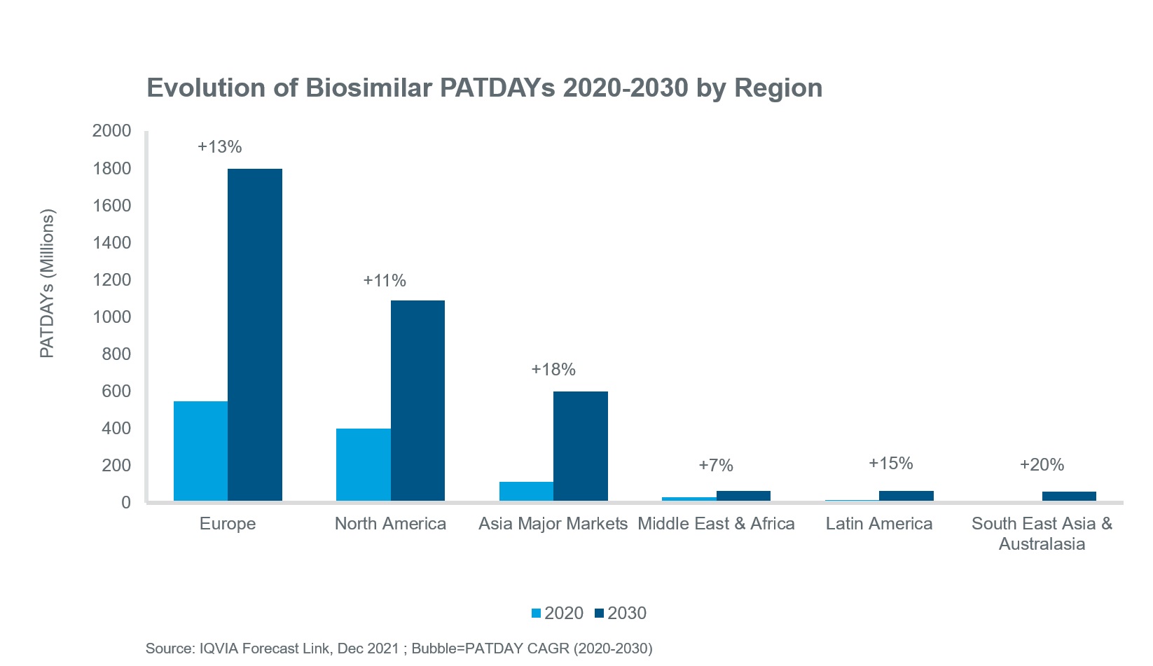 在区域一级,欧洲和北美将继续在全球生物相似量中占有最大份额,尽管预计主要亚洲市场、拉丁美洲和东南亚以及澳大拉西亚在未来十年量增速会更高