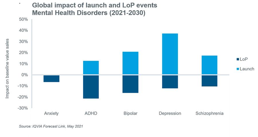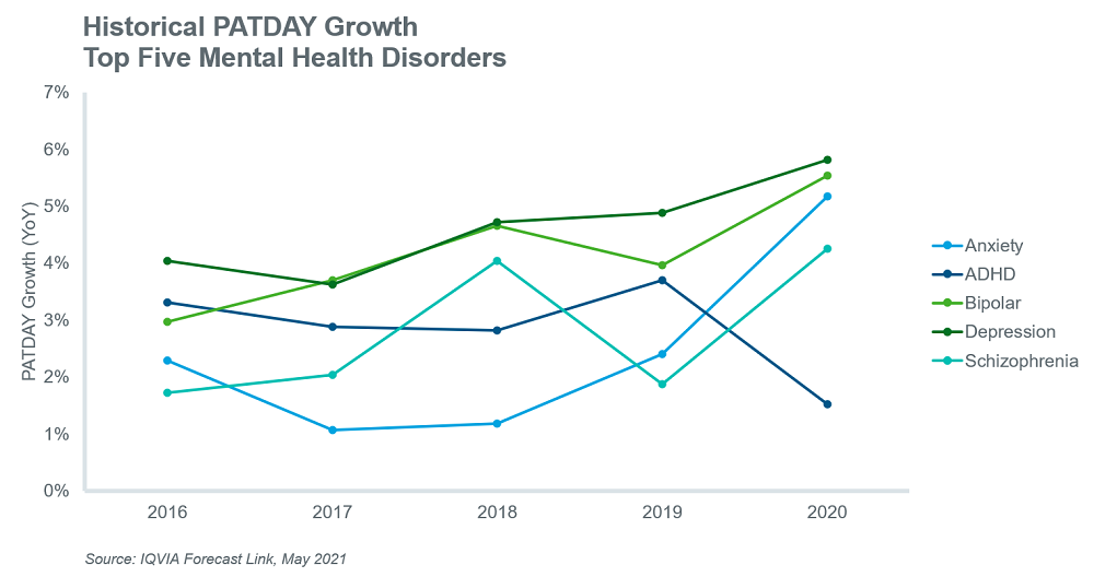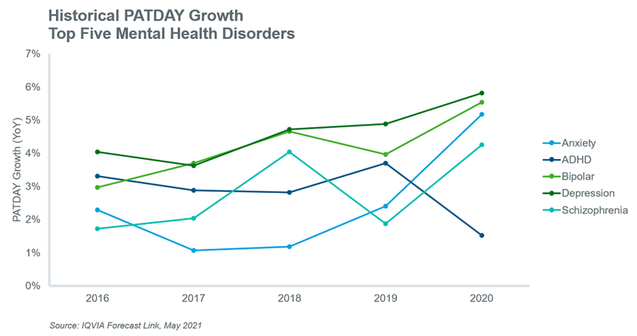 然而,最近,人们对Covid-19-19大流行对精神健康障碍患病率的短期和长期影响有很多猜测。必威手机APP例如,至少一项研究衡量了焦虑和抑郁症状的短期增加,作者认为,心理健康症状的增加将持续到冠状病毒疫情之外。2另一方面,另一项研究得出结论,必威手机APPpandemic has not increased symptom severity compared with pre-pandemic levels.3 Data from IQVIA’s Forecast Link appears to confirm that there has been a noticeable impact from the pandemic as evidenced by increased PATDAY growth in 2020 for all the mentioned conditions except ADHD. Indeed, the impact on anxiety seems to be the most striking and potentially supports one of the previously mentioned findings at least in the short term.