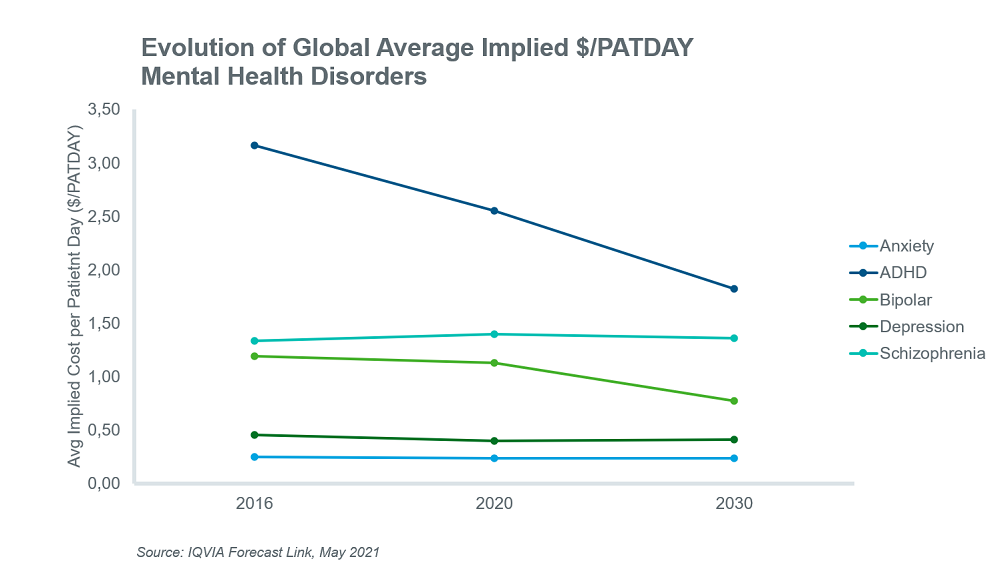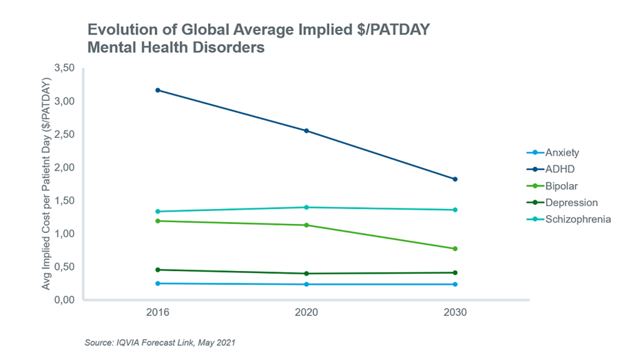 2017年,估计有7.92亿人患有精神健康障碍,这相当于全球十分之一的人。1在患病率方面,除药物滥用外,排名前五的精神健康障碍包括焦虑必威手机APP,抑郁,注意力不足,注意力不足多动障碍(ADHD),躁郁症和精神分裂症,这些疾病占所有患有精神健康状况的人的87%。必威手机APP这些条件的全球流行率在1990年至2017年之间一直相对稳定,因此,出售的药物的普遍人群和患者日(PATDAYS)的增长主要是由于全球人口的增长。根据IQVIA的预测链接,这五个条件也是2020年心理健康障碍中价值销售最高的,销售额约为386亿美元。必威手机APP
